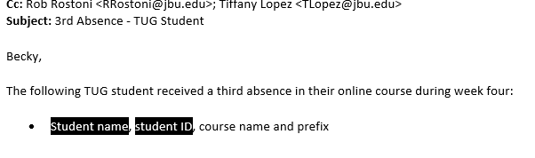 - If a JBU Online student has received an absence, send the student a notification via the Ally Alert System