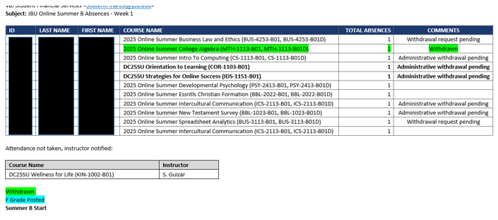 - If attendance is still missing, follow up with the instructor with a cc to their department chair or administrative assistant