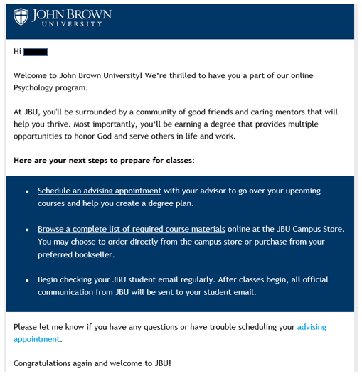 Enrollment Operations will confirm the event has been opened in Slate and that email communications will be sent to all incoming JBU Online and Graduate students.